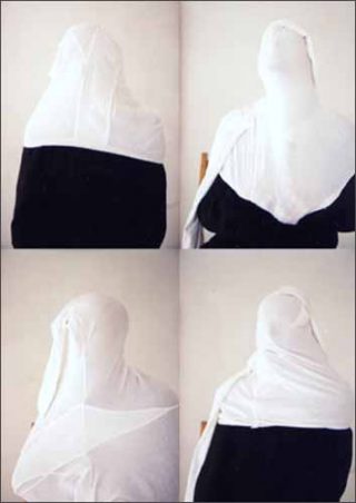 Be a Terrorrist, composé de quatre photographies presque identiques, prises entre 1999 et 2003, fonctionne comme un anti-portrait. Un homme recouvert d’un tissu blanc, qui est en fait un slip géant, pose seul face à l’objectif. S’agit-il à chaque fois du même personnage ? Nul ne peut l’affirmer. De quel genre de terroriste peut-il être question ? Sans doute l’artiste lui-même…