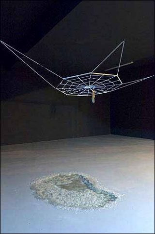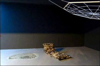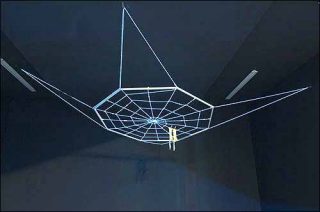 Ainsi, entre toile et étendoir, l’Etendoile d’araignée (2006), fil à linge lumineux en forme de grande toile d’araignée, importe dans l’intérieur de nos logis ce que la propreté nous commande ordinairement d’en exclure. Une énigmatique paire de chaussettes est suspendue à ce fil et rend mystérieuse l’identité de l’animal: un étrange bipède tisseur de toiles?