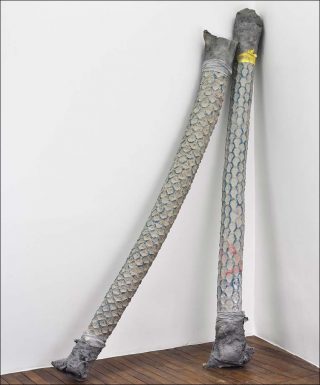 Stéphanie Cherpin. Je ne sais pas si je construis vraiment. Construire prend du temps, nécessite une certaine forme de planification. Et oui, j’ai l’impression que je n’ai pas le temps, qu’il y a urgence. Les gestes sont simples et les matériaux disponibles rapidement. Il faut que ce soit intense et fulgurant, parfois ça finit mal, mais il reste une trace de la rencontre, et c’est une trace qui va au-delà de l’existence de la sculpture. Il est aussi question de survie ; comment ériger une sculpture comme on monterait une barricade, comment une sculpture devient un abri –ou l’inverse-, et si je devais poser un carrelage ou un enduit en quelques minutes, quels seraient mes gestes ? Sauf que ce n’est pas une fiction, même si je n’identifie pas parfaitement ce qui me pousse dans cette nécessité d’agir là , maintenant. Les gestes simples et radicaux me permettent de voir les objets comme des présences, ils deviennent des sujets et le souvenir de leur usage est fantomatique, un peu perdu entre deux mondes. Les tentes ne pourront plus abriter personne, les barricades ne me protégeront pas. La transformation est irréversible mais il y a encore des indices de l’état antérieur. Une sculpture transgenre.