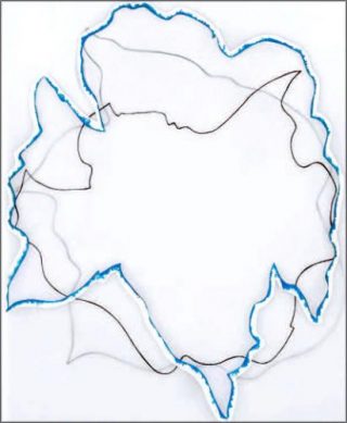 Si elle emprunte parfois les moyens de la peinture, c’est bien le dessin qui est au coeur du travail de Frédérique Lucien. À l’objet tableau, c’est-à -dire à la toile tendue sur châssis, elle préfère le lé de toile entaillé et simplement suspendu, les morceaux de toile découpés et rassemblés de manière aléatoire, quand elle ne peint pas directement sur le mur ses formes monochromes et échancrées. Comme chez Matisse et Ellsworth Kelly, deux de ses références en histoire de l’art, le dessin s’élabore entre figuration et abstraction, entre le modèle observé (graine, follicule, fleur ou feuille d’arbre) et la simplification de l’image. Le dessin est, jusqu’à la fin des années 1990, souvent assujetti au plan, sans profondeur ni modelé. Les oeuvres plus récentes échappent à cette règle, témoignant d’une nouvelle orientation : la matière et la forme redeviennent visibles et ne sont plus réduites au plan, à la simple surface. Tout, dans l’oeuvre de Frédérique Lucien, est organiquement lié : le spécimen naturel qui devient motif, le support choisi (papier, calque, plaque de forex ou de verre, toile peinte) qui induit une technique particulière (fusain, encre, gouache, acrylique, incision, découpe), la forme qui est déclinée en longues séries et à différentes échelles.