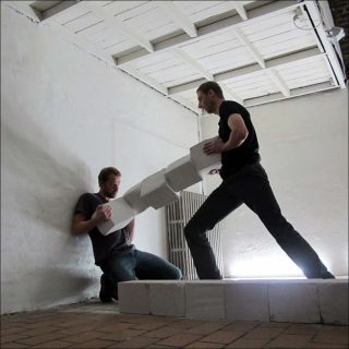Suite De Blocs Pour Quatre Mains est une pure performance, une suite d’actions en pure perte qui se veut ultimement une « parodie de construction ouvrière » tout autant qu’un défi physique et technique.
