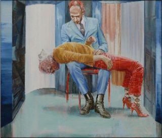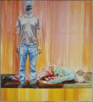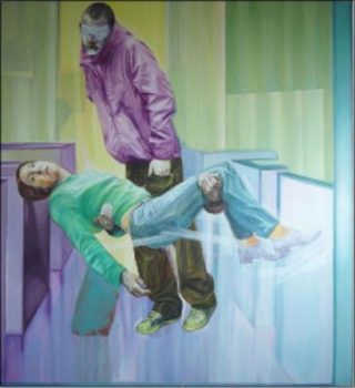 Iris Levasseur. Les tableaux sont un mélange de la vie sentimentale et du monde dans lequel on vit. Quand je marche près de la gare du Nord, là où j’habite, je ne peux m’empêcher de regarder les gens et d’avoir une pensée sur le contexte historique, en l’occurrence le capitalisme et ses limites. Mais je suis aussi attentive aux personnes que je croise pour d’autres raisons: des gestes et des attitudes que je vois chez elles me renvoient souvent à mes propres sentiments. Ce sont des choses qui se superposent. La grande histoire côtoie les petites histoires individuelles. C’est pour ça qu’il y a toujours une sorte de journal intime qui peut se lire à travers les tableaux mais qui est rarement lisible par le spectateur.