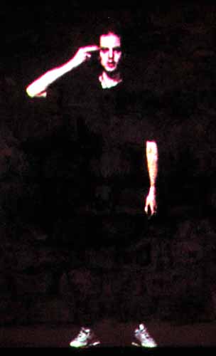 Silence il joue (2001) est une vidéo projetée en boucle sur un mur de pierre. La pierre est un élément clé qui permet de gommer le cadre de l’image; les corps peuvent s’inscrire sur et dans n’importe quelle surface et donner l’impression d’un surgissement. Un jeune homme de dix-huit ans joue à se tuer, il porte sa main à sa tempe en imitant le geste d’un revolver: « Pan !, dit-il, Je suis mort… » Diffusé en boucle, le jeu n’apparaît plus innocent. Est-ce un suicide ? Un simple jeu enfantin ? Le passage douloureux de l’adolescence à l’âge adulte est mis en scène : la mort de l’enfance, l’identité en construction, la fragilité de la vie.