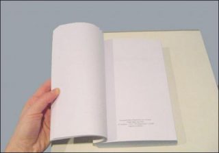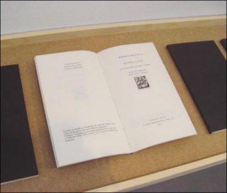 À côté, ISBN 978-2-9540208-8-4 (2011) se présente comme un triptyque. Au sol, cinquante-quatre piles de feuilles blanches de formats et de hauteurs variables semblent prêtes pour l’impression, ou bien plutôt rendues à l’état vierge. Au mur, une longue surface d’encre noire, puis un livre rassemblant des centaines d’«achevés d’imprimer», ces fiches d’identité qui signalent le lieu et l’année d’impression d’un livre. Cet ensemble constitue la bibliothèque de l’artiste, ou plus exactement en restitue la matière et l’histoire. Au sens propre, cette bibliothèque se visite, se regarde et se feuillette, en l’absence de tous les ouvrages qui la composent.