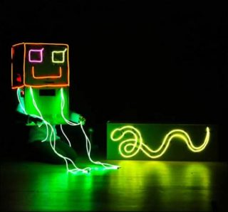 Sur scène, Barbara et Wilson, un robot en forme d’origami. Connecté à Internet, il est capable de débiter du texte issu de la toile – recettes, textes de chansons, analyses économiques, etc. Un système multi-caméra monté sur un casque permet à celui qui le porte de se voir à la troisième personne comme le personnage d’un jeu vidéo. Un micro-contrôleur bon marché permet de transformer la maison en un lieu de fiction projeté à des années-lumière de la terre. Un masque bricolé avec quelques leds invite à naviguer à l’intérieur de ses rêves et à survivre à ses propres cauchemars. Le tout sur fond de lumière El-wire qui dessine le décor et la silhouette de la performeuse.