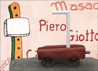À côté, le Studiolo est une réplique quatre fois plus petite du studio italien de Julien Jacques, où se meuvent les Å“uvres de la série « Accessoires ». Les Å“uvres ont l’air géantes, mal proportionnées à ce studio échelle un quart. Comme l’art, comme le jeu, le Studiolo est une imitation « pour de faux », « pour du beurre », l’occasion d’essayer, de tester, d’échouer, sans enjeux réels.