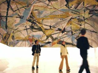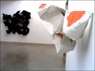 A l’image de cette vaine perspective de la peinture et tout en rappelant significativement les pratiques de démantèlement explorées par Supports-Surfaces, Transit 2001, un simple écheveau de sangles de nylon coloré et entremêlées qui tentent de se maintenir à l’équerre comme une vraie grille orthogonale, apparaît ici comme un lamentable trophée, plus convaincant encore.