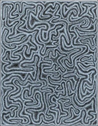 Les éléments répétitifs, les séquences, les courbes, les boucles et autres délicats labyrinthes deviennent des matrices qui donnent à voir les interstices, les passages et les mutations vers des formes biomorphiques. Les mouvements dessinés par James Siena, à la fois rationnels et poétiques, nous confrontent à des rébus optiques qui mêlent hasard et ordre; où le leitmotiv s’individualise dans un ensemble de prime abord uniforme. Tous les éléments, tels des cellules humaines, se répondent et se font échos apportant une vibration particulière à l’ensemble.