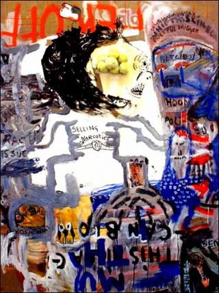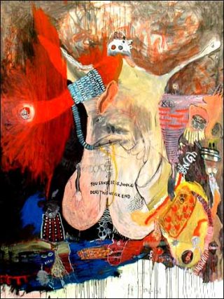 — Mainstream underground, 2004. 175 x 135 cm. Acrylique, crayon, encre indienne, huile et collage sur toile.