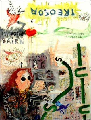 — Nicky Butt & a Cheap Schnabel, 2004. 175 x 135 cm. Acrylique, crayon, encre indienne, huile et collage sur toile.