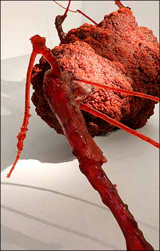 Pour Javier Pérez, les branches d’arbres sont des bronches aux couleurs sanguines. Le rouge est sa couleur favorite, qu’il qualifie de «couleur-sève». Sa cosmogonie est en pleine évolution, ses pièces en totale hybridation, en véritable mutation. Comme dans La Métamorphose de Kafka, où un homme se transforme en insecte, le végétal et l’animal s’entremêlent pour produire des œuvres hybrides et oniriques, fragiles et violentes, belles et répulsives.