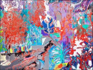 Le jardin est jonché d’intrigants vestiges: des lignes de couleurs tirées au cordeau, un chandelier rococo, une broderie, des lambeaux de papier à fleurs. On croit reconnaître, tel un motif dans le tapis, des hampes et des fleurs d’iris avec leurs feuilles en lame de sabre, ou un chemin à la droite du tableau qui décentre et fait basculer le paysage. Le flou du souvenir se mêle à la précision de la chose inventée. Rien ne forme à proprement parler de récit.