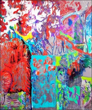 Ensuite, comme au terme d’une longue journée, le soleil décline. La palette s’obscurcit. C’est alors à une promenade nocturne que Michaële-Andréa Schatt nous convie. On cligne des paupières, on s’oriente doucement parmi les frondaisons noires et les champs d’orties. Est-ce la nuit ou après l’incendie? Selva oscura (mi ritrovai per una selva oscura (je me retrouvai par une forêt obscure) est le second vers du Chant I de l’Enfer, première partie de la Divine Comédie de Dante Alighieri) en tout cas, mais où abondent les phosphorescences et les réfractions. Il fallait éclairer. Poignet souple, main déliée. Ce tracé rouge, entrelacs de clématite ou de liseron, et ce jaune de Naples, petit pan de mur d’une maison retrouvée, enluminent le gris.