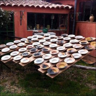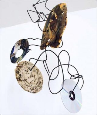 Aux extrémités des fils métalliques du mobile Obsolescence programmée de l’artiste japonaise Natsuko Uchino, un disque laser côtoie des disques en céramique peints de motifs et couleurs variés. Les installations associent les différents matériaux traditionnellement utilisés pour la sculpture et les objets usuels ou organiques. Avec une prédilection pour la céramique parce qu’elle est issue de la terre et traditionnellement utilisée pour la fabrication d’ustensiles de cuisine ou d’objets décoratifs; parce qu’elle se situe entre l’environnement, l’agriculture et la sociabilité.