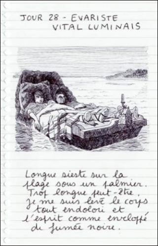 Dans le même espace sont rassemblés une sélection de dessins de la série L’encyclopédie du naufragé, une fresque intitulée Les poissons chantent pour tout le monde et une installation, vestige de son projet La promesse de la mer.