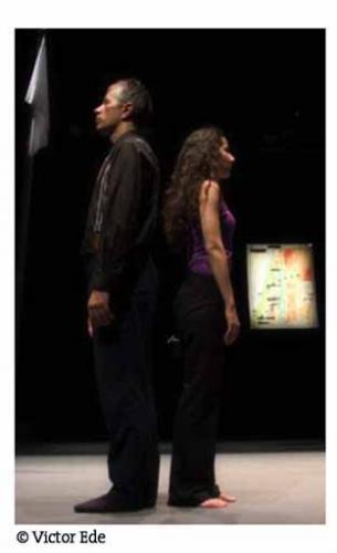 «Côte à côte sur scène symétriquement, une femme, un homme, deux pupitres, sur fond de conférence géopolitique. Elle — simple messagère ou représentante légale ? —, s’exprimant en arabe, énonçant un plan de paix, entre utopie et réalisme froid. Lui, traduisant, méthodiquement. Mais les mots ne suffisent pas. Il faut des symboles. Un hymne. Un drapeau. Une posture. Dont acte. Mais les symboles ne suffisent pas. Il faut jeter son corps dans la bataille. Peut-on traduire un corps? Peut-on danser un plan de paix? » Gaspard Delanoë