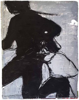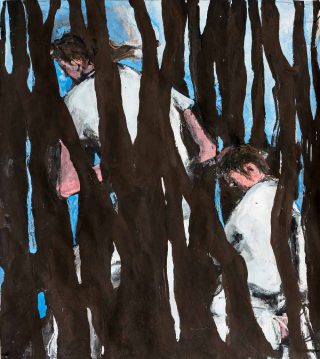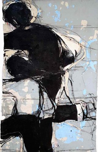 Les œuvres de Jean-Charles Blais rassemblées dans l’exposition « Voilà » représentent deux figures humaines vues de dos en forme de silhouettes noires détachées sur un fond aux teintes bleutées. Il est parfois difficile de discerner s’il s’agit de deux personnages différents ou bien d’un seul accompagné de son ombre. Par moment, les silhouettes courent et fuient ensemble ; à d’autres, elles se reposent l’une sur l’autre et s’enlacent.