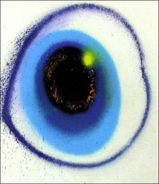 J’ai recommencé un travail à l’aérosol que j’avais abandonné en 1991, et j’ai peint des portraits avec cette technique en décembre 2003. Je voulais voir où j’en étais, ce que je pouvais faire. J’en ai fait deux cents. A l’intérieur de ce travail, j’ai fait une série d’yeux, mais juste comme ça, par délassement. C’est vraiment de la peinture pour faire de la peinture. C’est un exercice de style. Faire des portraits c’est autre chose, mais des yeux c’est plus facile, il y a moins de contraintes. Tous les problèmes de composition sont absents, soit c’est raté, soit c’est réussi. On ne dit rien d’autre que ce qui est marqué.