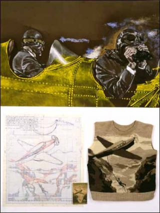 — Le Fortin de la soif (ou le pull-over mité), 2003. Pastel et texte manuscrit sur carton, croquis original sur papier millimétré, pull-over tricoté, fascicule. Diptyque, 80 x 120 cm.