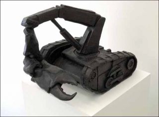 Ici, on touche une dimension moins humoristique, car si, au premier abord, on a tendance à sourire, les questions que suggèrent les œuvres sont beaucoup moins drôles. Ainsi, on est amusé par des armes à feu en bois qui émeuvent par leur maladresse ou un bulldozer auquel il a poussé une pince de crabe à la place de la pelle.