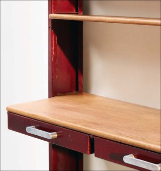 En ce début d’année 2017, la galerie Downtown expose une sélection de mobilier des années 1930 aux années 1950. Parmi les pièces composant cette sélection, figurent trois créations de Jean Prouvé (1901-1984) datant des années 30 : le bureau CPDE en métal laqué noir (1935), le lit Fabert en tôle d’acier plié laqué vert (1935), et la console-bibliothèque Van Dyck en tôle d’acier plié laqué rouge, elle aussi conçue aux alentours de 1935.