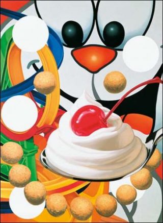 D’Easyfun (1999-2003) à Antiquity (2009-2014), Jeff Koons fait la part belle au devenir image de la peinture. Utilisant le collage, il rassemble sur une même surface des éléments hétérogènes qu’il fragmente et stratifie. Plus que jamais, une large place est accordée aux stéréotypes américains — grands espaces, excès de nourritures industrielles, super-héros et autres personnages de bande dessinée — stéréotypes auxquels Jeff Koons entremêle des références plus personnelles, allant de graffitis enfantins aux standards de l’art antique. Ainsi de ses derniers «Gazing Balls» (2013) qui juxtaposent des ornements de jardin à des moulages en plâtre de chefs d’œuvre de l’art classique.