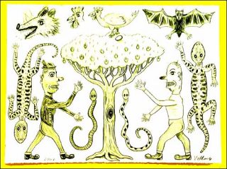 L’exécution abrupte et caricaturale, voire naïve, rapproche les dessins de ceux que l’artiste a pu voir en Polynésie dans les tribus primitives lors de ses voyages d’étude. On songe également aux planches d’histoire naturelle, ou aux illustrations des aventures coloniales du XIXe siècle. Chaque animal est inscrit dans un système à la fois singulier et doté d’une apparente cohérence. Au-delà des frontières géographiques, les récits que conte la série sont ceux de l’évolution, de la vie où l’homme n’est qu’un animal parmi d’autres. On est renvoyé à un stade primitif de la connaissance — Men and Tree Scene.