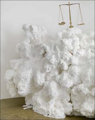 Plus massive, la sculpture Scale of Justice Carried by Shore Foam imite dans une mousse artificielle le déferlement de la vague; sur le sommet de l’écume figée se dresse une balance, dans un équilibre précaire. On comprend l’idée sans peine: le vacillement de la justice humaine face au déchaînement des forces naturelles…