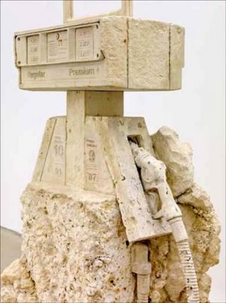 — Jennifer Allora et Guillermo Calzadilla, Petrified Petrol Pump, 2010. Calcaire riche en fossiles. 210 x 250 x 180 cm.