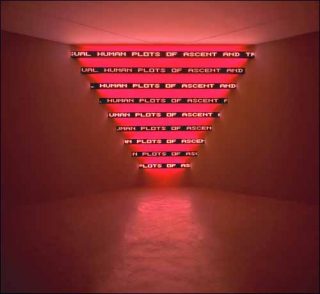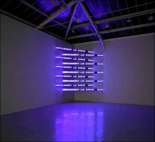 Le rythme est ici donné par la disposition de ces « conduits électroniques », croisés, en porte à faux les uns par rapport aux autres. La magie de ces mots en suspension est soulignée par le reflet qu’ils diffusent sur le sol luisant de la galerie. Comme un couché de soleil, un plan d’eau qui ferait miroir, l’espace s’imprègne de poésie. L’immobilité s’incarne dans le lieu, dans les apparitions lentes et successives des phrases du poète. Le corps de la lettre moins soumis à l’instabilité des variations rencontrées dans les autres pièces, se présente comme support neutre propice à la lecture. Mais la violence silencieuse des termes qui se rencontrent et qui finissent par fusionner nous place une fois encore dans une mise en abîme du regard.