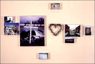 La musique (folk, country) est présente dans ce parcours d’errance relative dont l’artiste restitue des fragments, des gros plans, des détails, des paysages, des portraits. Les petites images (photos faites par l’artiste, dessins achetés à des prisonniers) et les objets qui les accompagnent, dont un extraordinaire cœur en fil de fer barbelé, n’ont pas plus l’allure de reliques que de documents. Il s’agirait plutôt de morceaux de vie, de témoignages d’amitié, de sources pour un voyage à venir. Deller avait besoin de quitter l’Angleterre et d’être aux États-Unis pour continuer son travail artistique, prendre de la distance s’imposait ; il a fallu entrer dans le paysage « jusqu’au bout » : l’artiste a acheté un terrain.