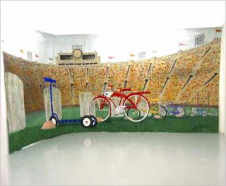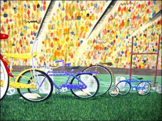 Une autre série de dessins Monster Faces and Ads (2005), de dimensions variables, représentent des visages plus ou moins effacés derrière de grandes traces de pinceaux, des bavures de peinture ou encore des trous dans le papier. Ces visages représentés sont comme des lambeaux de portraits, déréalisant la figure humaine en la montrant comme en proie à des troubles intérieurs. Dans la deuxième salle de la galerie, un immense décor sur toile peint à l’acrylique représente une partie d’un stade un peu spécial : Left Behind 3# (2005). On a l’impression de se retrouver dans le stade bondé où sont dessinés vélos, trottinettes, etc. customisés à l’aide de fausses pierres précieuses. Ces moyens de locomotion, appartenant chacun à une époque précise, sont rangés chacun devant une tombe, calés entre les fesses des morts dépassant de la terre. Les tombes sont celles, par exemple, d’Henri Kissinger, ancien chef de la diplomatie américaine. Left Behind 3# semble ainsi symboliser les attentes déçues et la désillusion par rapport à la politique américaine.