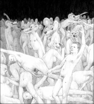 Enfin, dans quelques dessins de la série des Dream Object des hommes nus se transforment en souris géantes aux dents carnassières.