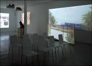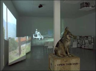 Une des vidéos suivante montre l’artiste travestie en animal, minuscule apparition sur fond d’enseignes lumineuses démesurées. Elle joue avec l’espace, l’échelle et met en scène deux univers dont l’incohérence fait sens. Le loup, symbole de l’état sauvage et d’un peuple replié sur lui-même, est introduit dans un monde factice, artificiel, un «show» ouvert à des croyances modernes. Cette confrontation, ce déplacement spatio-temporel semble se répandre dans toute la pièce comme un leitmotiv.