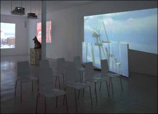 Le film suivant est à la fois projeté sur un mur et sur un paravent qui lui est accolé. Les images se déstructurent, envahissent l’espace d’exposition et s’avancent vers le spectateur. Le mouvement des éoliennes, d’un train qui passe ou de fils électriques qui se déploient à perte de vue se démultiplie et donne une dimension supplémentaire à l’ensemble.