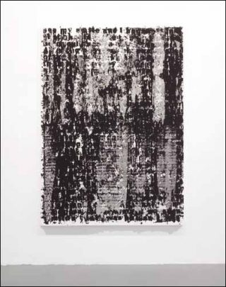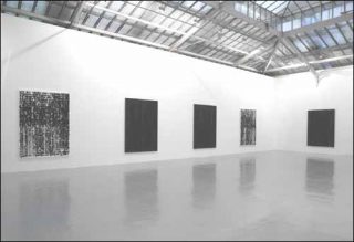 On s’approche des grands formats qui contrastent avec la pâleur de la pièce. La peinture se mélange à la poudre charbon et laisse apparaître un support blanc, en réserve, ou un fond noir uniforme. La lumière s’accroche sur ces légers reliefs, sur les grains en saillies. De haut en bas, l’épiderme de la toile devient de plus en plus granuleux. Notre œil perçoit alors les phrases sérigraphiées par Glenn Ligon. Répétées sur toute la surface, elles deviennent de moins en moins lisibles. La matière les rongent, les recouvrent et prend le dessus. Le texte devient inaudible.