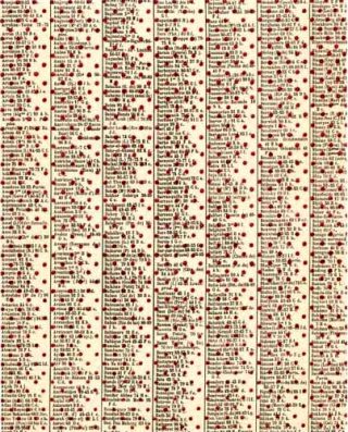 Les motifs, autre spécificité de l’œuvre de Jochen Gerner. semblent eux aussi puisés dans le répertoire visuel courant des objets imprimés. Par exemple : Papier peint, au titre démonstratif, se compose de points identiques, régulièrement espacés, sur une longue liste imprimée de noms de lieux. Le tout est un grand papier directement collé sur toute la hauteur du mur.
