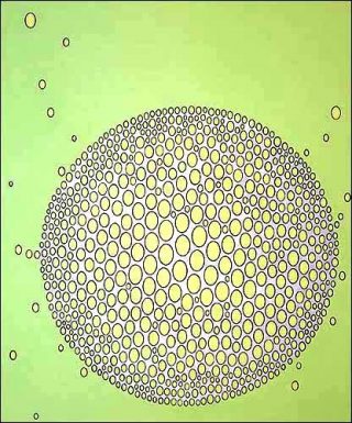 La peinture de John Tremblay réintroduit sciemment le langage plastique des années 60: les ronds, les ovales, les carrés colonisent des tableaux aux couleurs franches et glacées virant du fluos aux argentées. Ces petites formes géométriques organisent la surface, ou plutôt se l’approprie jusqu’à parfois la recouvrir, voire même l’étouffer complètement. Entremêlées, entrecollées ou dispersées comme des satellites autour d’une force d’attraction, les formes impriment immanquablement un mouvement, introduisent l’idée du déplacement, à l’intérieur de l’œuvre et dans l’esprit du spectateur.