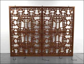 Marsia reprend les Jaali, ces motifs architecturaux ornementant nombres d’édifices islamiques en Inde. Anita Dube en fait une matrice qu’elle dépose contre l’un des murs de la salle, légèrement inclinée et retenue de la chute par des cordes de soutien. Ici pas de pierre, plutôt du polystyrène repeint pour imiter la facture monumentale, surtout pour alerter sur la fragilité des symboles qui s’effondrent.