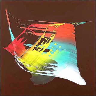 De cette calligraphie séminale, on a le sentiment d’une empreinte d’une grande légèreté, comme une peau ou un voile, attiré puis emprisonné par un «fond» rétenteur. Rien dans cet onirisme organique de motifs rappelant des formes de vie unicellulaires microscopiques, ne nous informe cependant sur le procédé employé par l’artiste: il joue sur la 2-D qu’offre les logiciels de dessin numériques, pour créer rhomboïdes et autres vortex versicolores, dont il reprend les vues d’écran à la peinture.
