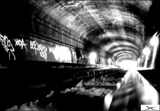 JR. Depuis sept ans environ. J’ai d’abord commencé gamin avec les tags, je suis rentré dans la mentalité graffiti où tu veux poser ton nom à gauche à droite. C’est en 2000 que j’ai commencé à photographier mes compères graffeurs. J’étais intéressé d’aller dans des endroits où personne n’allait, dans les tunnels et sur les toits. Je m’intéresse aux “communautés de style” qui graffent, dansent, skient. J’essaie de comprendre leur mentalité pour ensuite la retranscrire en photographie. J’expose mes photos dans la rue pour faire partager cette expérience à un maximum de monde.