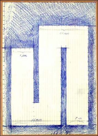 Conjointement aux pages du journal sont exposés quelques dessins de méandres, une peinture et une petite sculpture, mais aussi des croquis préparatoires aux méandres. Ces croquis de petits formats, là encore tracés sur du papier quadrillé mais aux carreaux rectangulaires, épousent la proportion des arceaux de la ligne brisée des méandres, aux segments plus ou moins épais. Réalisés au stylo à bille et au crayon, dégagés de la stricte contrainte de l’exécution, leur dessin est plus libre. Quelques cotes au stylo sont indiquées dans les marges, d’une écriture plus libre elle aussi.