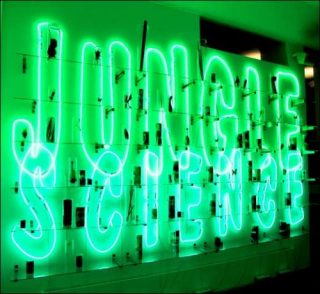 Dans la première installation (en forme de bibliothèque) un agencement recouvre deux grands néons déclinant les mots «Jungle» et «Science».
