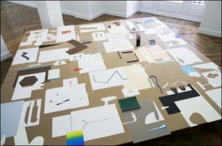 À ces deux approches de la peinture s’ajoute une troisième pratique, qui relève davantage de l’installation: les objets, photographies, papiers, cartons peints ou découpés, qui dans l’atelier lui servent de matériau d’expérimentation sont remployés par l’artiste pour former des compositions sur de grands plateaux horizontaux; elles rendent visible son processus de création au sein de l’espace d’exposition, et informent le regardeur sur les origines de son répertoire de formes peintes, tout en constituant des œuvres à part entière, qui peuvent se suffire à elles-mêmes.