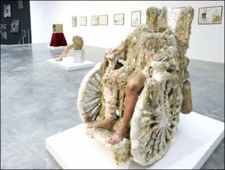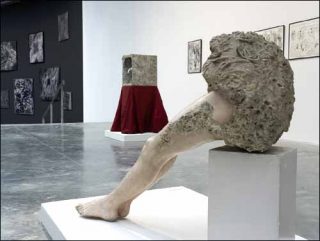 Libération : l’artiste exprime ici le bouillonnement de ses sentiments et tente de se libérer de ses obsessions grandissantes. Il met en place une sorte de thérapie plastique qu’il partage avec le public en laissant libre cours à chaque interprétation personnelle. Aliment blanc cultivable. Femme assise ne laisse apparaître qu’une partie du corps de la personne «scellée» à son fauteuil roulant.