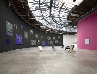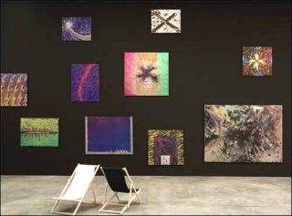 Les transats disposés face aux toiles nous invitent à nous asseoir un moment pour contempler le spectacle de cette pluie d’étoiles filantes. Les reflets colorés sont changeants en fonction de l’éclairage et des déplacements du spectateur. On longe la paroi, happés par les scintillements hypnotiques de ces particules frénétiques, et les peintures en noir et blanc s’enflamment de rouge et d’argent.