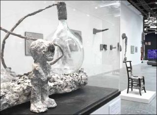 Étouffement : les fils qui s’entremêlent, solidifiés par une substance inconnue, rongent avec voracité les objets exposés. Ces cocons ne sont pas porteurs de naissance. Ils deviennent eux-mêmes des insectes qui dévorent les éléments qu’ils enveloppent et qu’ils auraient dû protéger. Les «reliques» présentées nous forcent à faire un effort d’identification et nous plongent dans l’horreur hallucinatoire de l’artiste.