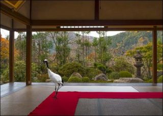La série «Monogatari», qui fait suite aux séries «Fables» (2004-2008) et «India Song» (2008-2010), traite symboliquement de la vie sauvage et de son articulation à la Culture, en se rapportant cette fois-ci à l’héritage japonais et à ses mythes. Les animaux sont placés dans d’élégantes architectures que l’artiste a découvert à travers Le Dit du Genji, célèbre nouvelle moderne écrite par Murasaki Shikibu, courtisane de l’époque Heian au cours du Xème siècle. Ces temples sont encore visibles partout dans Kyoto et nombres d’entre eux renferment de magnifiques décors réalisés par la célèbre école de peinture Kanō.