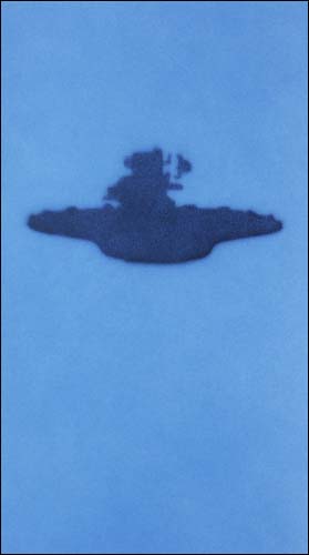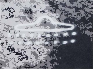 Le ciel est également en question avec les Flying Saucers, ces ovnis aperçus dans le ciel du Nouveau-Mexique, pris en photos ou filmés. Un ciel qui, cette fois, évoque un ailleurs, un au-delà , un prolongement de notre imagination et, qui sait, de notre réalité. Une forme floue, sombre, se découpe sur un fond bleu. On la reconnait au premier regard : une soucoupe volante s’éloignant vers les étoiles. La technique picturale par projection utilisée par le couple d’artistes donne un aspect granuleux aux tableaux qui retranscrit la qualité généralement médiocre des photos d’ovnis. La même technique est utilisée pour les Creatures, nos charmants homologues d’une autre planète. Avant de les peindre, Jugnet + Clairet ont agrandi par informatique des formes censées représenter des extraterrestres. Il en résulte une silhouette mouvante, incomplète mais qui dirige notre imaginaire tout droit sur la piste des petits hommes verts.