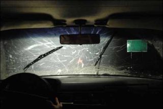Nous sommes perdus mais confortables, aucun dénivelé de la route ne secoue la caméra. On pourrait continuer longtemps ainsi, bercés par le rythme des essuie-glaces qui résonne comme une pulsation cardiaque. Notre perception s’éclaircit et, progressivement, le regard s’organise.